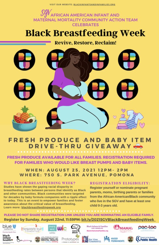 In honor of National Black Breastfeeding Week, PHFE WIC is partnering with SGV African American Infant and Maternal Mortality (AAIMM) Community Action Team and the Pomona Wellness Community to hold a Fresh Produce and Baby Item Drive-Thru Giveaway Event on Wednesday, August 25 from 12-2pm.