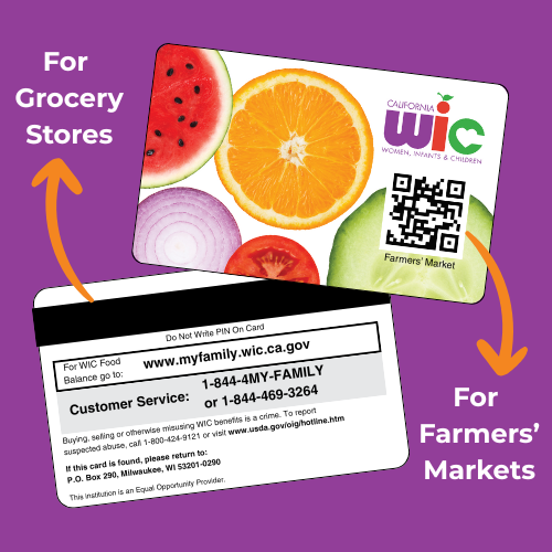 Families can shop at WIC-authorized grocery stores using the magnetic stripe on the back. The QR code in front allows families to shop for their fruit and vegetable benefits at WIC-approved farmers’ markets. You can shop for all of your foods at once or just a few at a time.