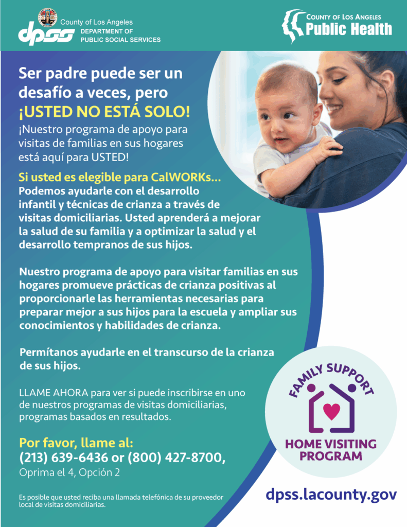 ¡Buenas noticias! El Programa de apoyo  familiar para visitas domiciliarias ahora está inscribiendo familias. ¡Este programa lo une a un profesional que brinda orientación sobre el embarazo y la crianza de los hijos, acceso a servicios sociales, recursos laborales y más!