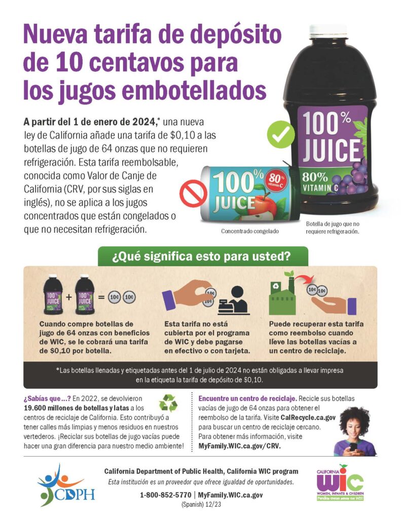 - A partir del 1 de enero de 2024, la Ley de Reducción de Basura y Reciclaje de Envases de Bebidas de California exigirá que se agregue una tarifa de diez centavos ($0,10) a la compra de bebidas embotelladas.