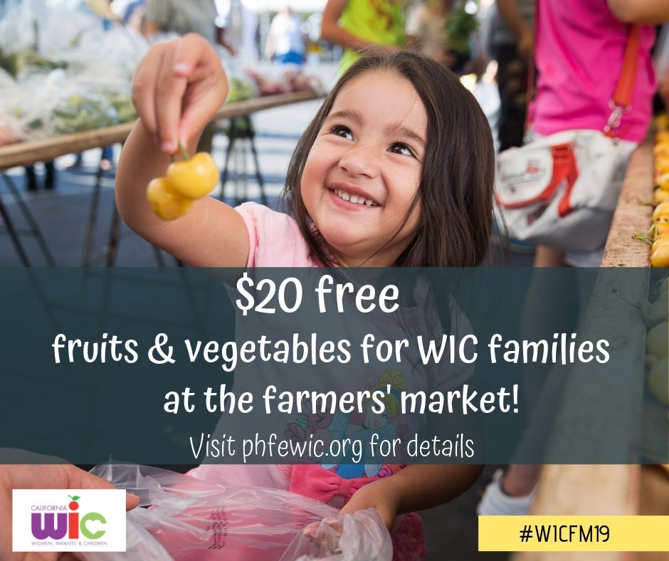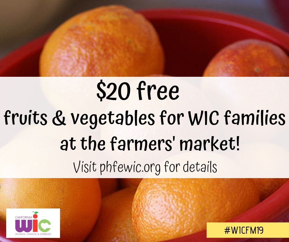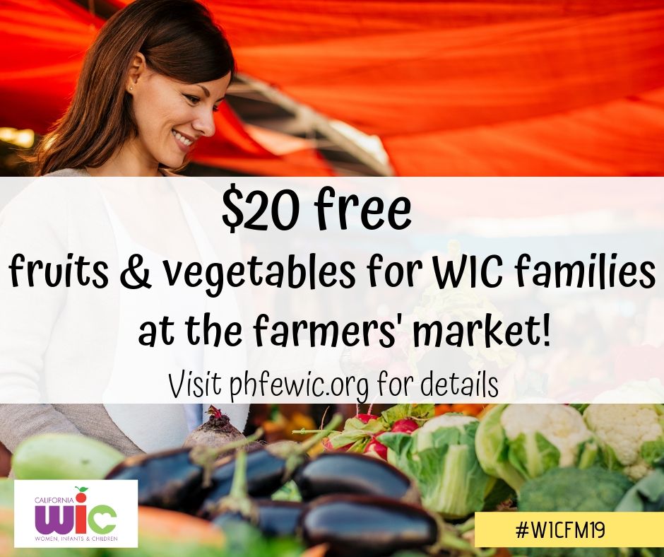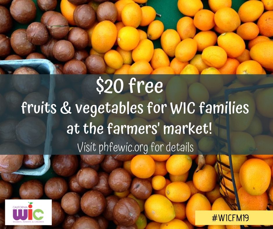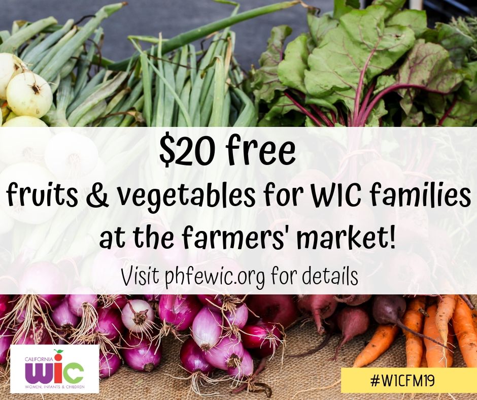 - WIC Families get $20 FREE fruits and vegetables at the [NAME] Farmers’ Market! Look for the friendly faces wearing bright orange on [Dayofweeks] from [WIC FM TIMEFRAME], and show your WIC folder to claim your free $20. This once-per-summer offer is for PHFE WIC participants only, one per family while supplies last! Visit demo.phfewic.org/ for more details. #WICFM19 #PHFEWIC