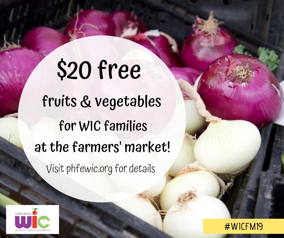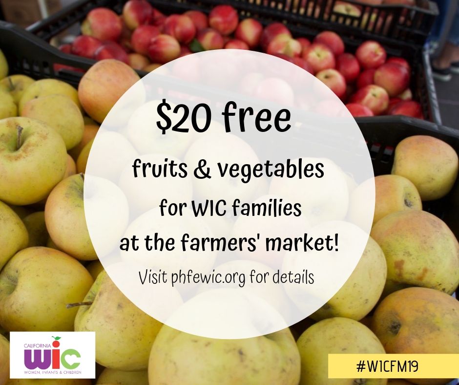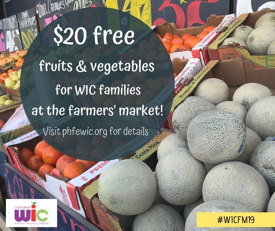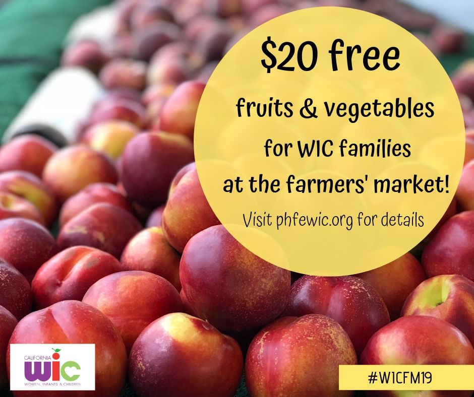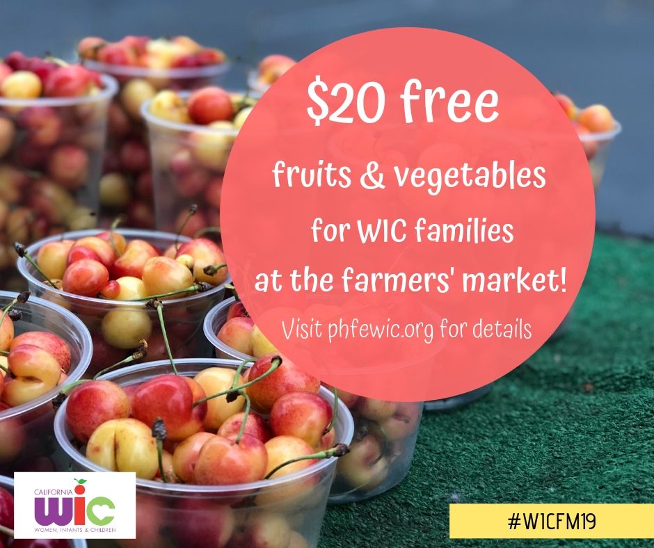 - WIC Families get $20 FREE fruits and vegetables at the [NAME] Farmers’ Market! Look for the friendly faces wearing bright orange on [Dayofweeks] from [WIC FM TIMEFRAME], and show your WIC folder to claim your free $20. This once-per-summer offer is for PHFE WIC participants only, one per family while supplies last! Visit demo.phfewic.org/ for more details. #WICFM19 #PHFEWIC