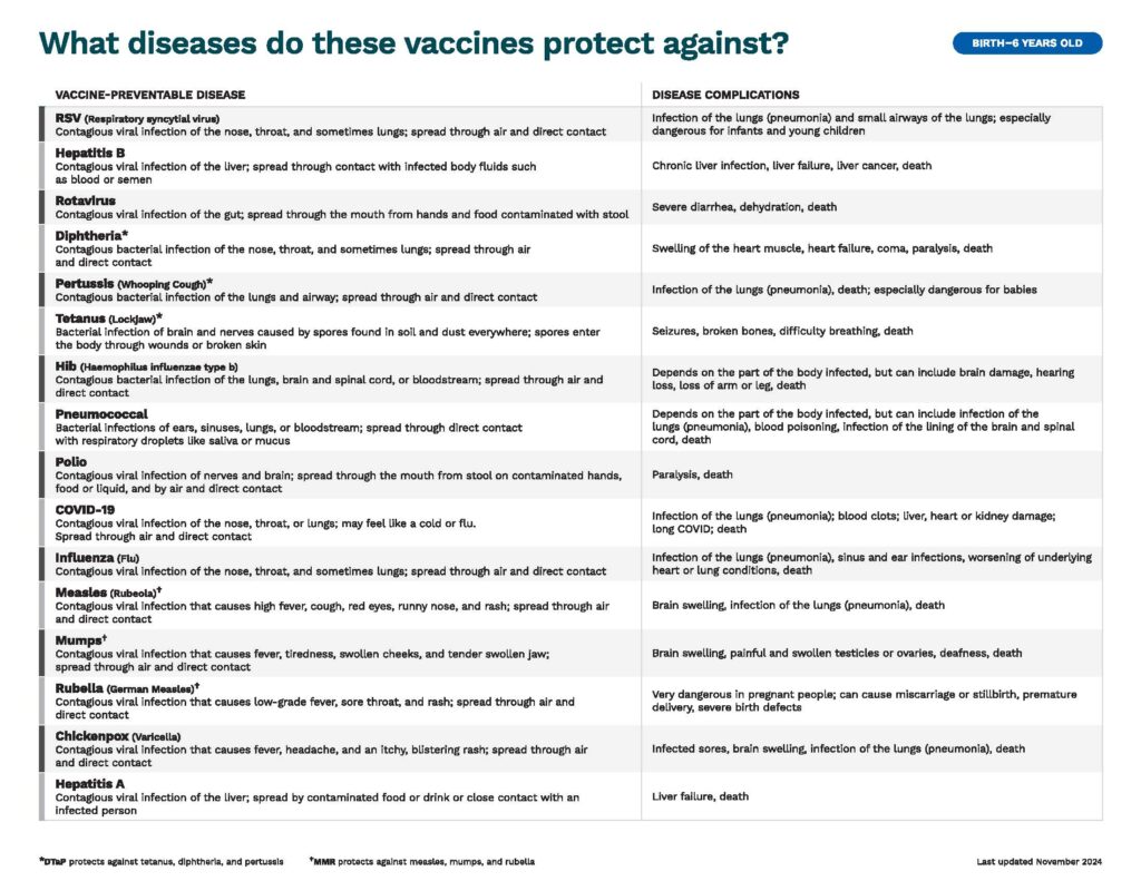The CDC’s easy-to-read vaccine chart can help you learn what vaccines are recommended for each age and why each are important for keeping your child healthy.